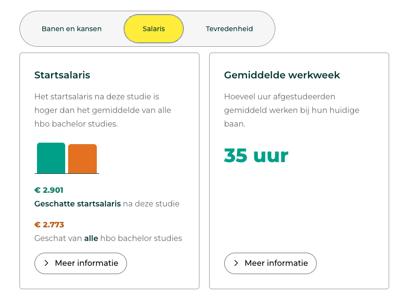 In 2024 zijn er arbeidsmarktindicatoren vanuit CBS Microdata toegevoegd aan de Studiekeuzedatabase. Deze indicatoren laten onder andere kansen op werk, type banen en salarisindicaties zien. Voor studiekiezers is dit relevante informatie. Daarom heeft Studiekeuze123.nl verschillende ontwerpvarianten getest bij de doelgroep. Tom: “De jongeren gaven hierbij aan dat het verschil tussen startsalaris en gemiddeld hbo-/wo-salaris niet duidelijk was. We hebben dat verbeterd in zowel de visuele weergave als de tekstuele uitleg. Daardoor is het voor de studiekiezer nu eenvoudiger en beter te begrijpen.”